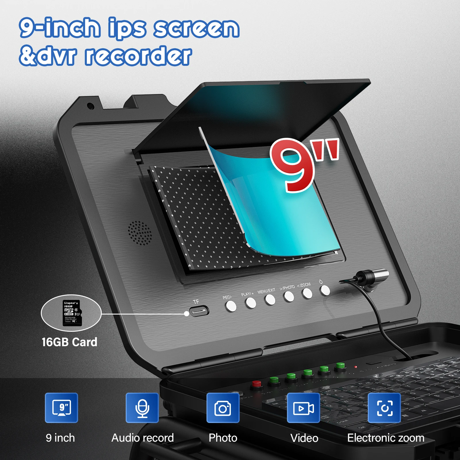 1. Monitor:9 inch IPS color record monitor with sun-visor for bright environment outside (CH1/CH2 Video Switch)